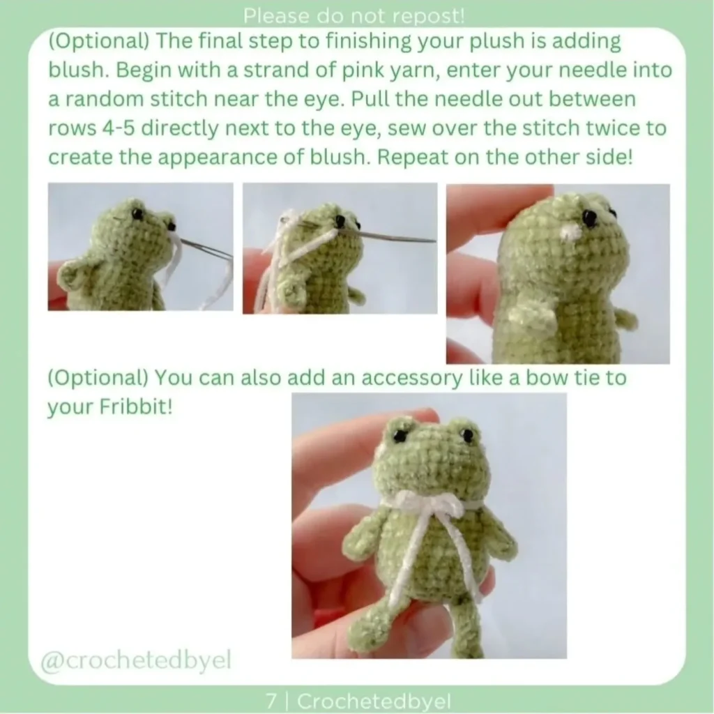 • Blush: Use a strand of pink yarn and a needle. Pull the needle out between rows 4-5 directly next to the eye. Sew over the stitch twice to create the appearance of blush. Repeat on the other side.