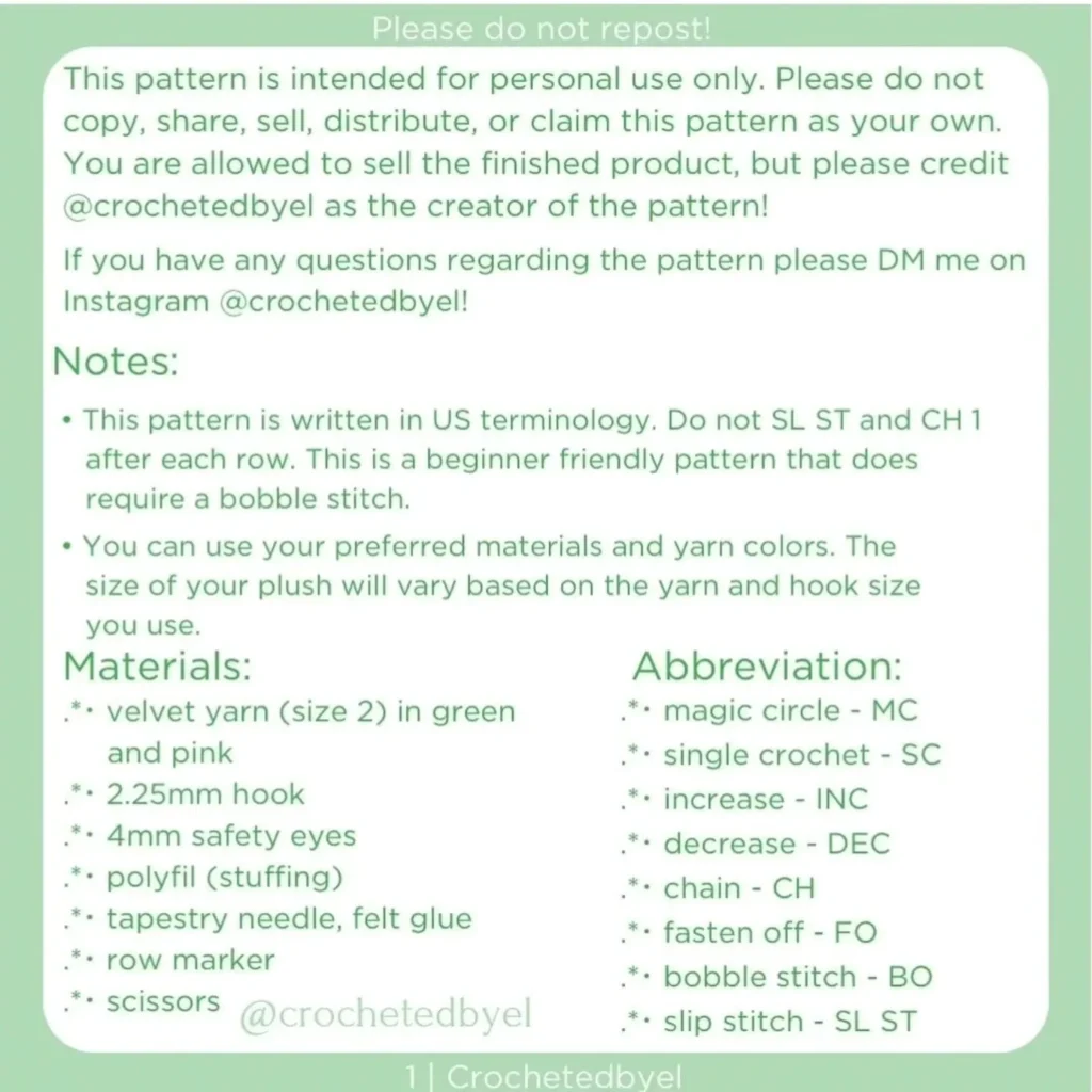 • Yarn: Velvet yarn (size 2) in Green and Pink