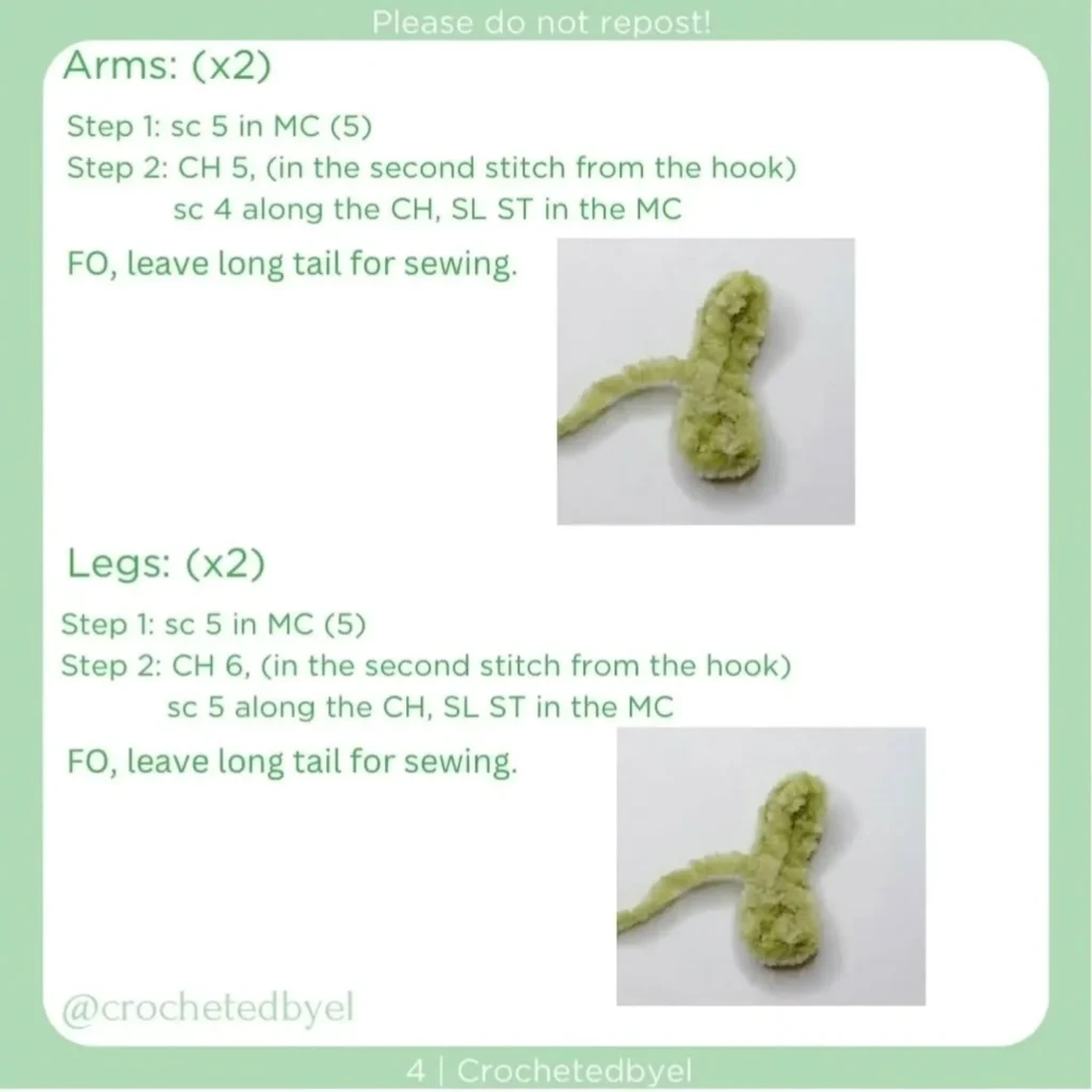 2. Preparation: Before sewing the arms and legs, weave the yarn tail for sewing to the top of the arm/leg. This allows the limb to be evenly sewn to the body.