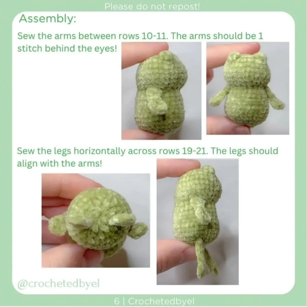 4. Legs: Sew the legs horizontally across rows 19-21. The legs should align with the arms.