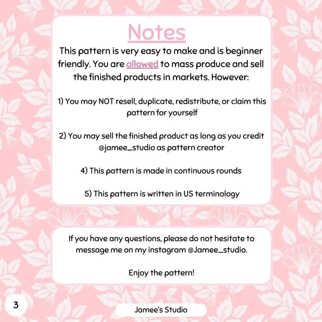 - This pattern is beginner friendly and allows for mass production and selling of the finished product, provided you credit @jamee_studio as the pattern creator.