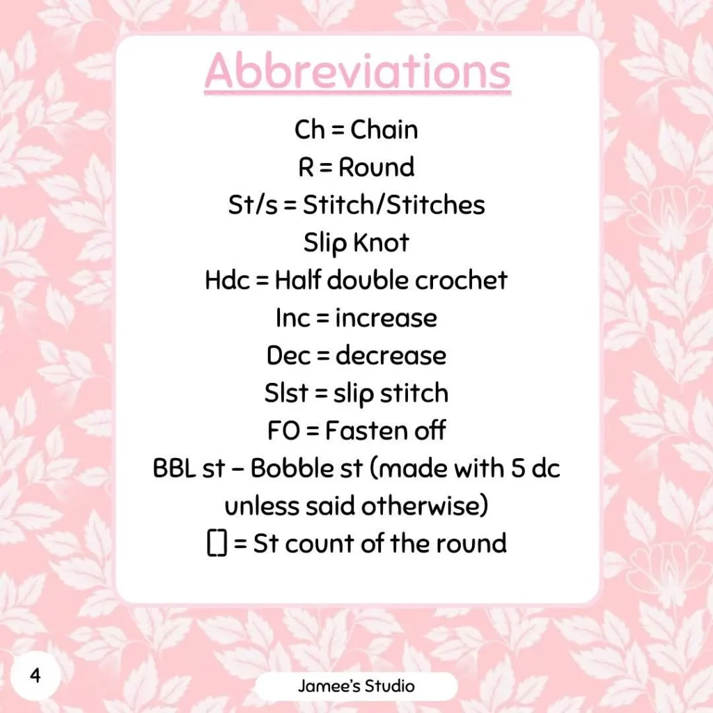 | BBL st | Bobble Stitch (made with 5 dc unless said otherwise) |