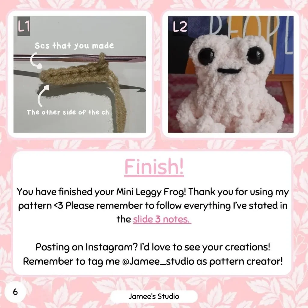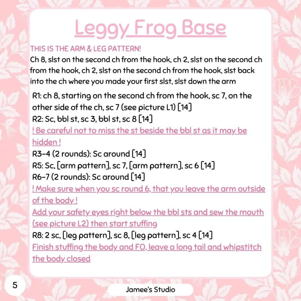 Hello! I have extracted the complete “No-Sew Mini Leggy Frog” crochet pattern from the images you provided.