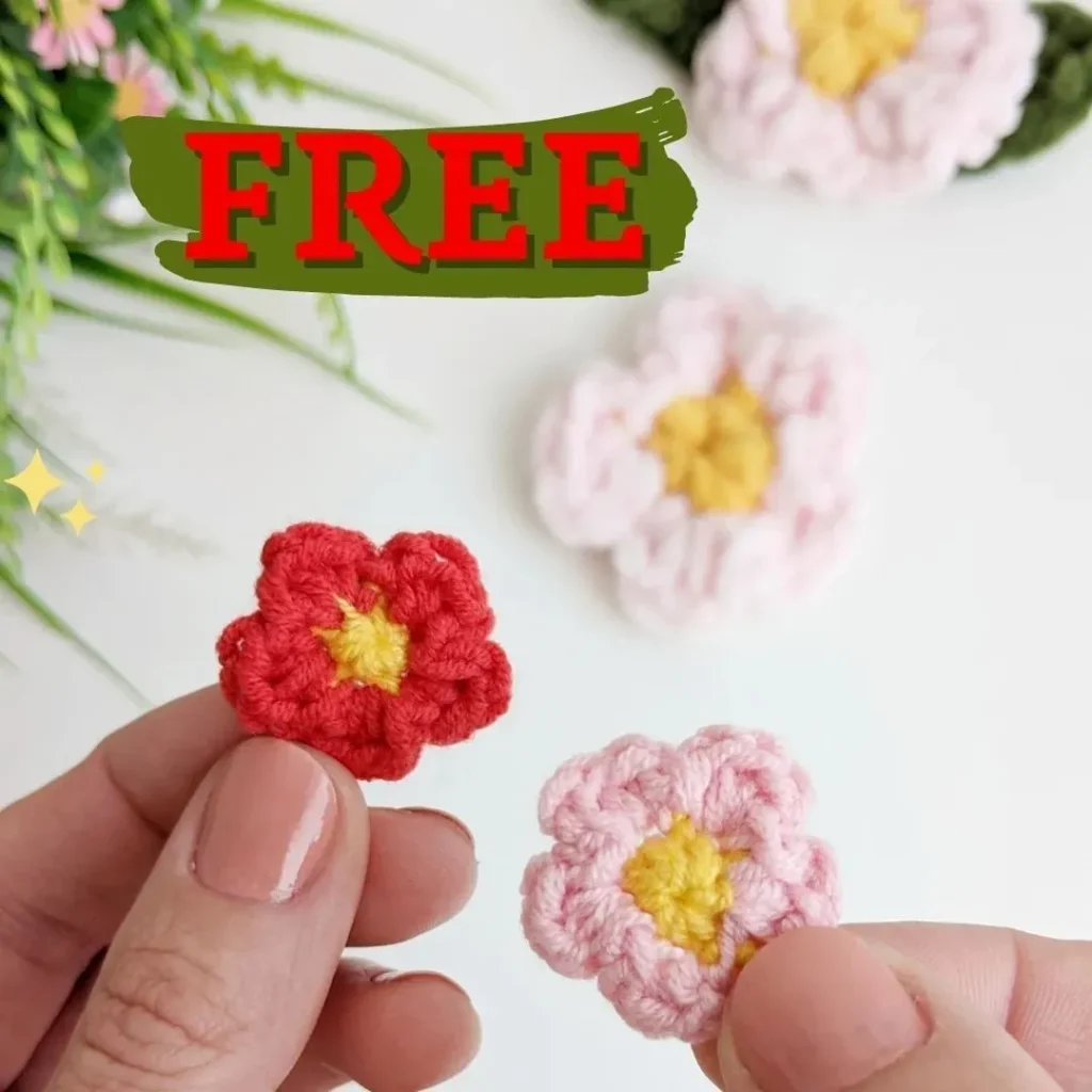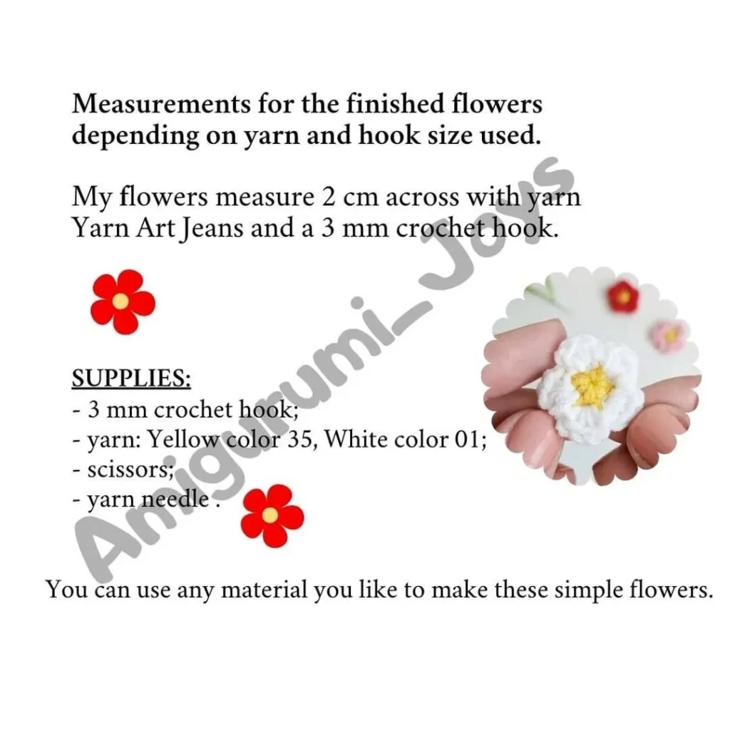 This flower measures approximately 2 cm across when made with Yarn Art Jeans and a 3mm hook.