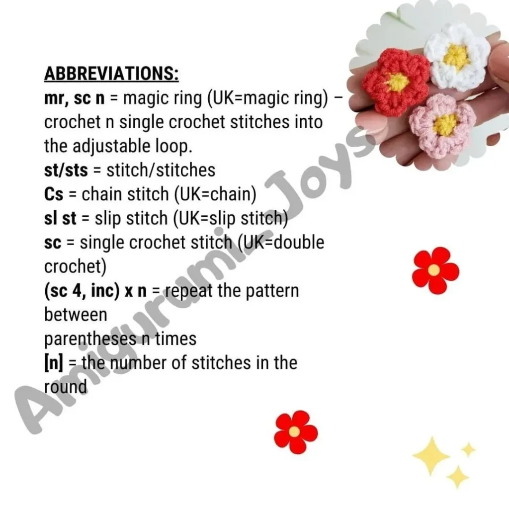 - mr: magic ring (UK=magic ring) – crochet $n$ single crochet stitches into the adjustable loop.
