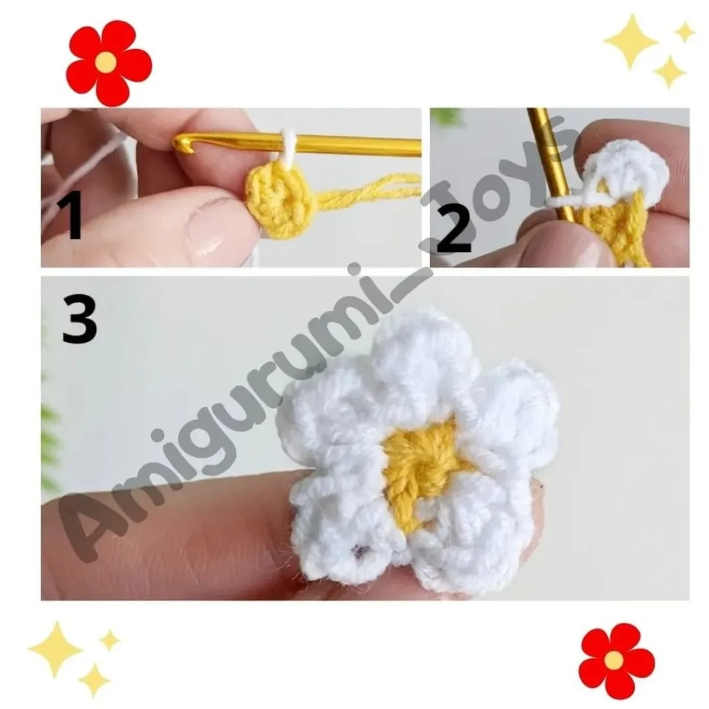 - Round 2 (with white color yarn): (crochet in one st: Chain 1, sc 2, Chain 1, sl st) it’s the first petal, (sl st in the next st, (crochet in one st: Chain 1, sc 2, Chain 1, sl st) ) x 4.